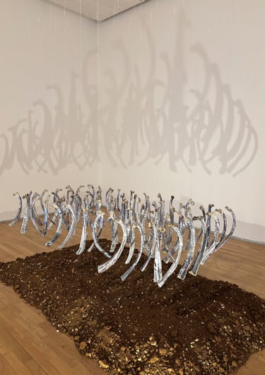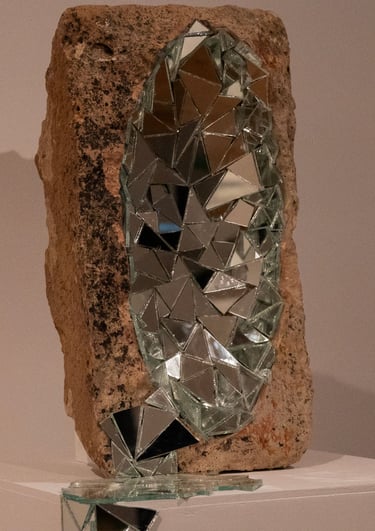 Material operates as structure and method. Stone, mirror, soil, thread, glass fragments, and architectural supports form constellations that hold tension, pressure, and instability. These elements activate the space and guide the movement of the body, translating lived conditions into tactile and spatial experience. Weight is carried, surfaces are fractured, and reflection becomes a shifting field that repositions the viewer within the work.
