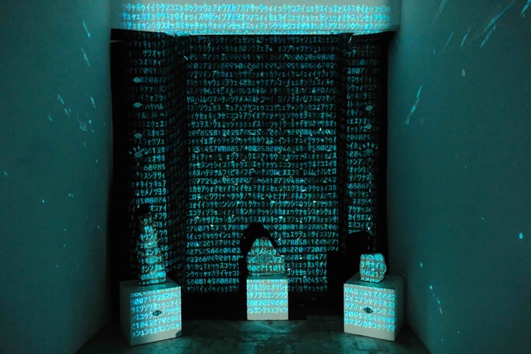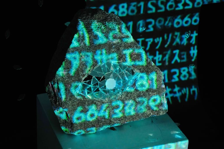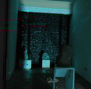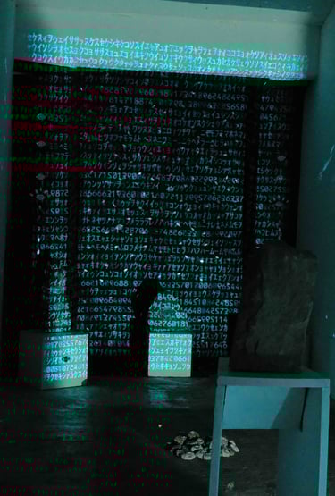 Between the Eye and the Soil is an immersive installation that places the viewer inside a chamber of surveillance, where seeing is no longer an innocent act but a mechanism of power. Numerical sequences—algorithmic, endless, and unreadable—are projected across walls, stones, and mirrored surfaces. These numbers do not narrate; they classify, calculate, and anticipate. They echo contemporary systems of algorithmic governance whose roots lie in colonial modes of knowledge: to map is to possess, to observe is to dominate, and to render visible is to make governable. The space functions as a contemporary cave—where reality is not encountered directly, but mediated through projections that shape perception while concealing their authority.