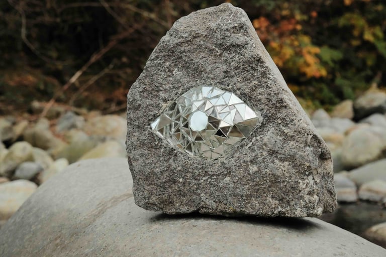 Within this space, stone and mirror operate in tension. A fragmented mirrored face resists coherence, dissolving any stable image of the self. Identity appears here not as essence, but as a surface continuously shaped by external observation. In the foreground, large stones embedded with mirrored eyes return the gaze, interrupting its one-directional flow. At the center, smaller stones gather quietly, carrying mirrored eyes as well—an indirect invocation of the stone as an act rather than an object. This gesture recalls the Palestinian Intifada of stones, not as historical illustration but as a living metaphor: the stone redirected toward the machinery of surveillance itself. What is thrown is not force alone, but reflection—an attempt to fracture the gaze that seeks to fix, extract, and control. Between the eye and the soil, the work holds a space where memory, land, and resistance remain unresolved, insisting on opacity as a condition of survival.
