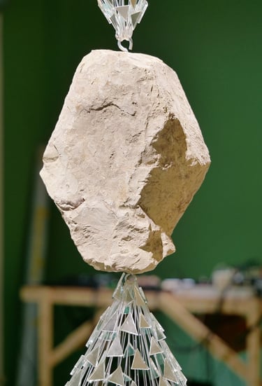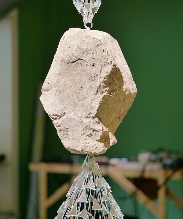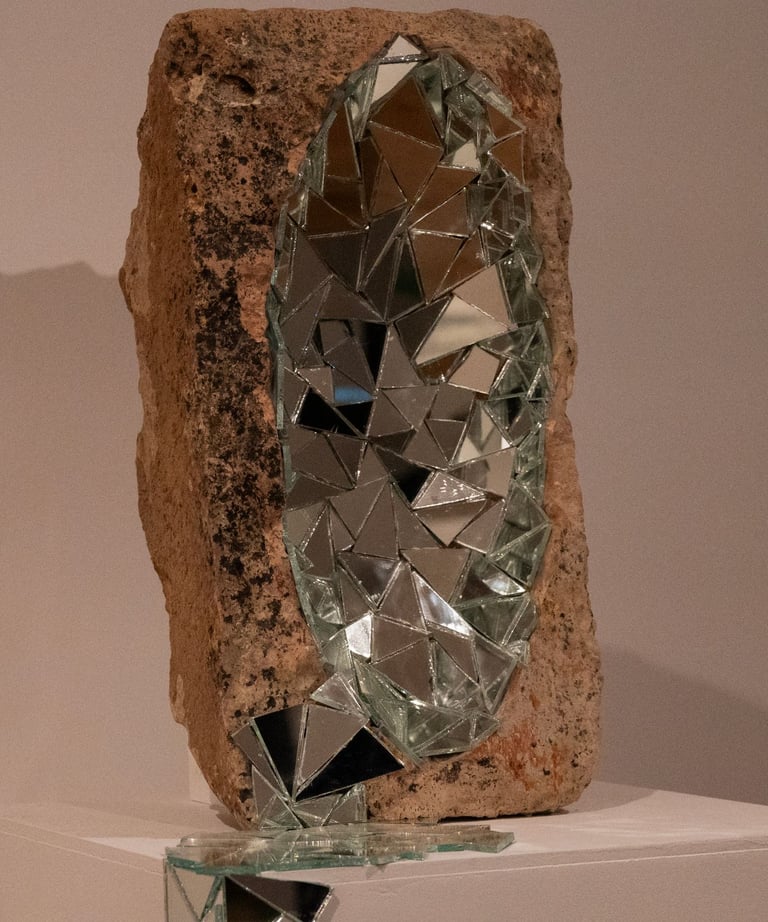Material in my practice is both structure and method. Stone, mirror, soil, thread, glass fragments, and architectural supports come together in constellations that hold tension, pressure, and instability. These materials animate the space and choreograph the viewer’s movement, translating lived realities into tactile, spatial terms. Weight is borne, surfaces fracture, and reflection becomes a field of shifting perspectives—inviting the viewer to reconsider their own position within the work.