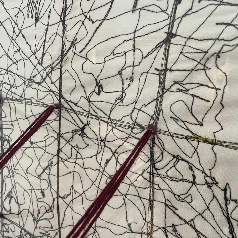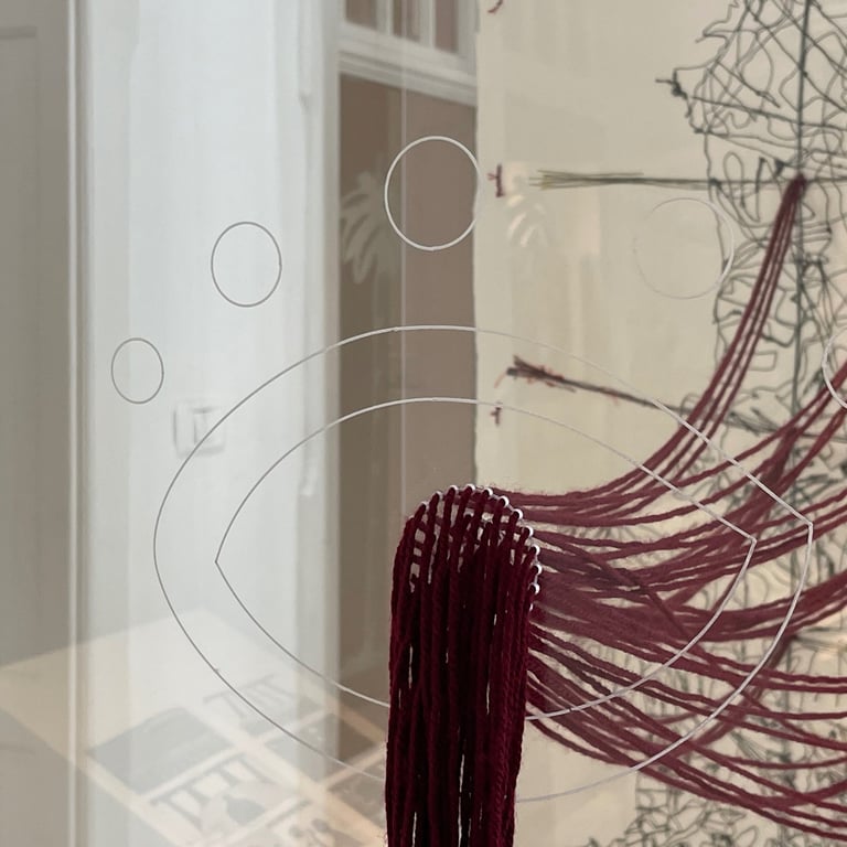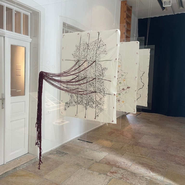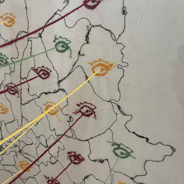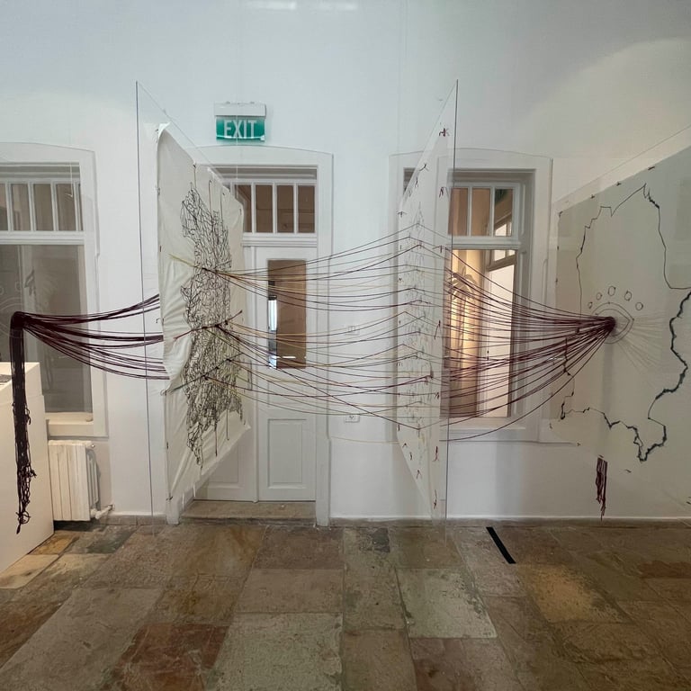 In this work, the map is used as a critical tool that reveals this forced abstraction, where the concept of control is deconstructed through threads that mimic invisible divisions. What is unseen here is the essence of the place and the collective memory, while maps and archives remain mere tools that widen the gap between human and land.